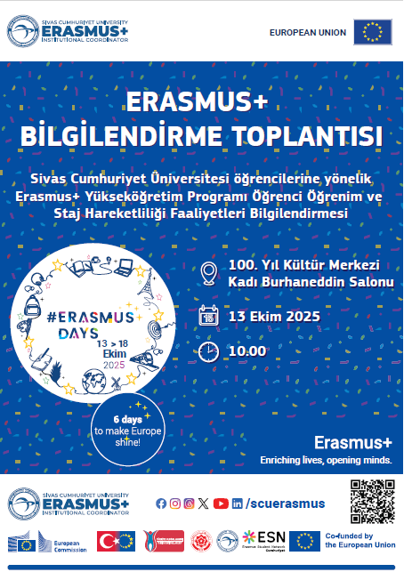 Üniversitemizde öğrenimine devam eden tüm öğrencilere yönelik Erasmus+ Değişim Programı kapsamında gerçekleştirilecek öğrenim ve staj hareketlilikleri hakkında genel bilgilendirme yapmak amacıyla, 13 Ekim 2025 tarihinde saat 10.00'da 100. Yıl Kültür Merkezi Kadı Burhaneddin Salonu'nda bir toplantı düzenlenecektir. Tüm öğrencilerimize duyurulur.
